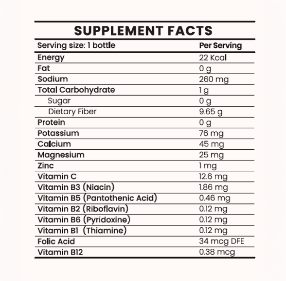 Ingredients: Water, Polyglucose 5g,Psyllium Husk 5g, Citric Acid, Natural And Artificial Flavor, Sodium D - β – Hydroxybutyrate 0.42g, Salt, Calcium D - β – Hydroxybutyrate 0.28g, Creatine Monohydrate 0.2g, Potassium Citrate, Magnesium L-aspartate, Sodium Citrate, Magnesium D - β – Hydroxybutyrate 0.14g, Turmeric, Carmine,Annatto Extract, Sucralose, Sodium Hyaluronate, Tremella Fuciformis Polysaccharide, Stevia Leaf Extract, Vitamin C, Pea Peptide, Zinc Glycine, Niacin, Calcium D-pantothenate, Thiamine, Riboflavin, Vitamin B6, Vitamin B12, Folic Acid.
